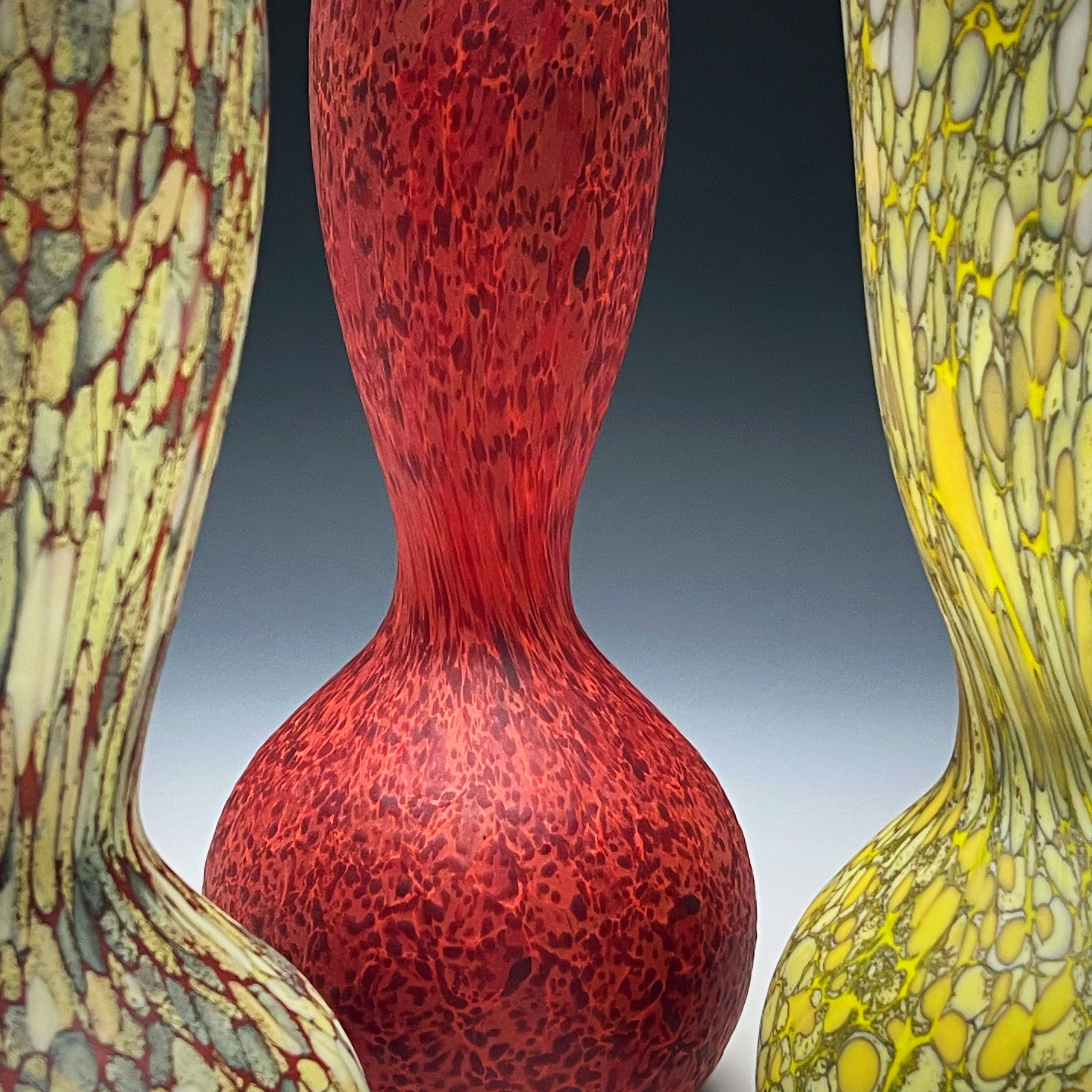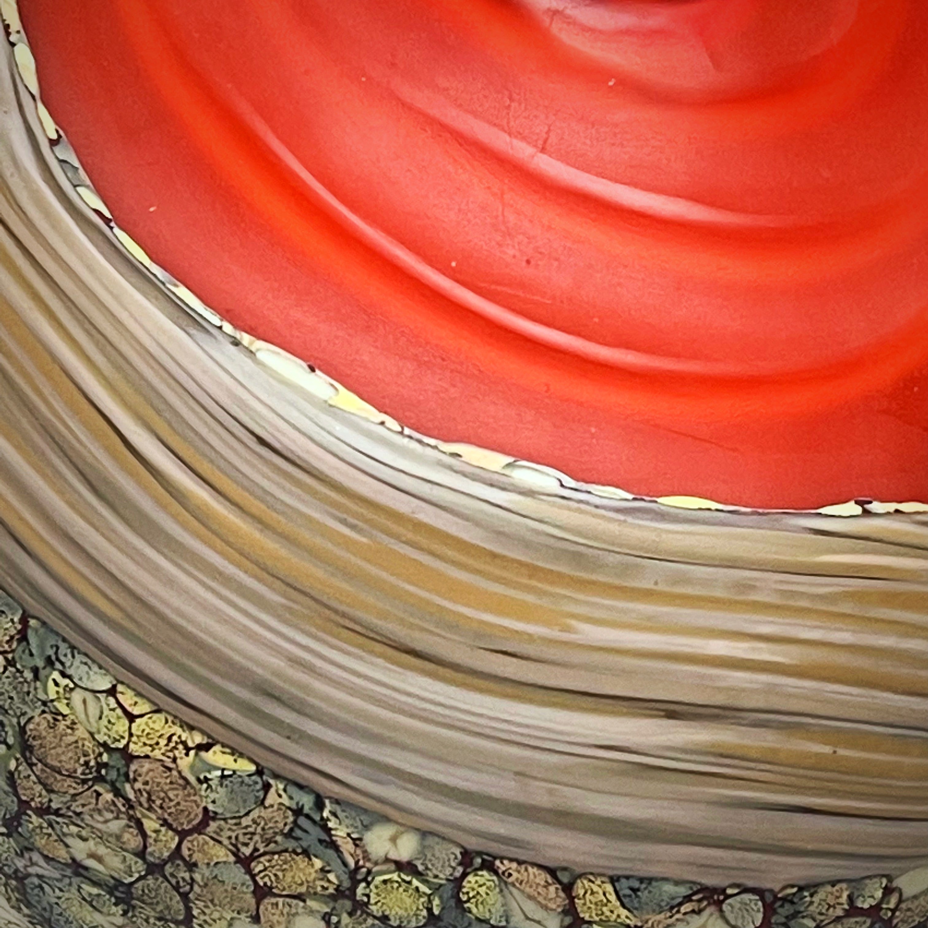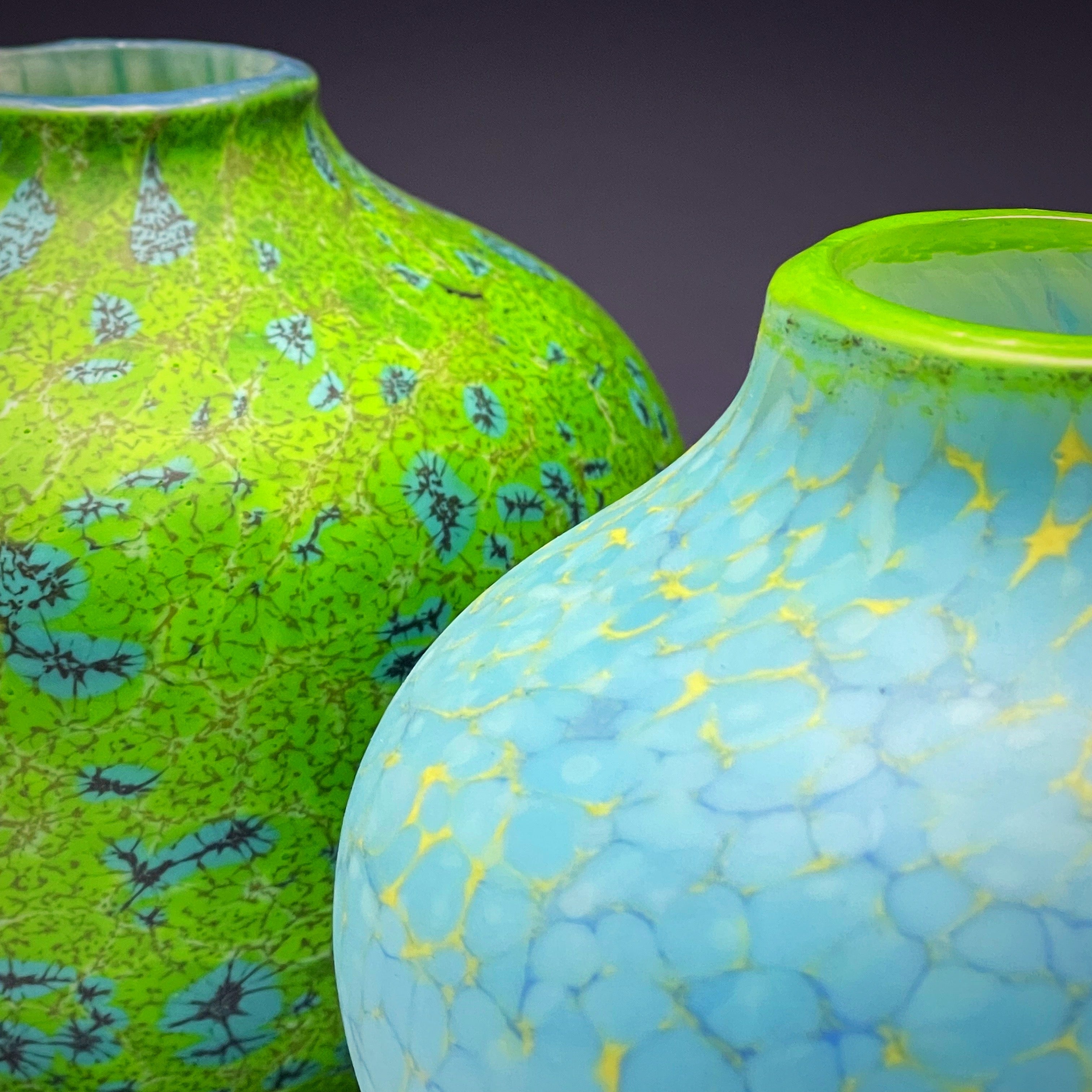 This hand-blown glass bowl is One of a kind and an experimental piece trying to develop a new idea based on the Shoal series. This series inspired by the thought of revealing what is unseen, the tides reveal a sandbar, erosion reveals basalt beneath. The intricate pattern comes to life using glass chips and powder, meticulously arranged to ensure consistency. The Green color pattern is inspired by lush green Forests, vast open meadows as well as delicious green Vegetables. The thoughtful composition mirrors the natural beauty that surrounds us. The interior of the bowl is translucent, creating a sophisticated contrast between the exterior and interior. After cooling, the vase is engraved using a diamond wheel, carving through the rim of the adding depth and visual interest. The sandblasted matte finish adds a touch of sophistication to the bowl, creating a matte finish that accentuates the subtle pattern on the surface. This bowl creates a strong centerpiece to elevate your space where the beauty of the natural world and the artistry of glass converge in a harmonious display.